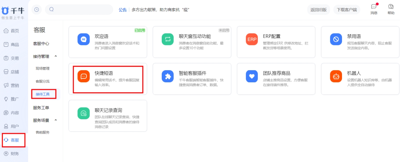 請(qǐng)不要通過(guò)聊天窗口-管理團(tuán)隊(duì)快捷短語(yǔ)的入口進(jìn)入設(shè)置,該入口正在升級(jí)中,會(huì)顯示舊版快捷短語(yǔ)頁(yè)面,快捷短語(yǔ)中的圖片可能會(huì)不顯示且可能存在快捷短語(yǔ)丟失的情況